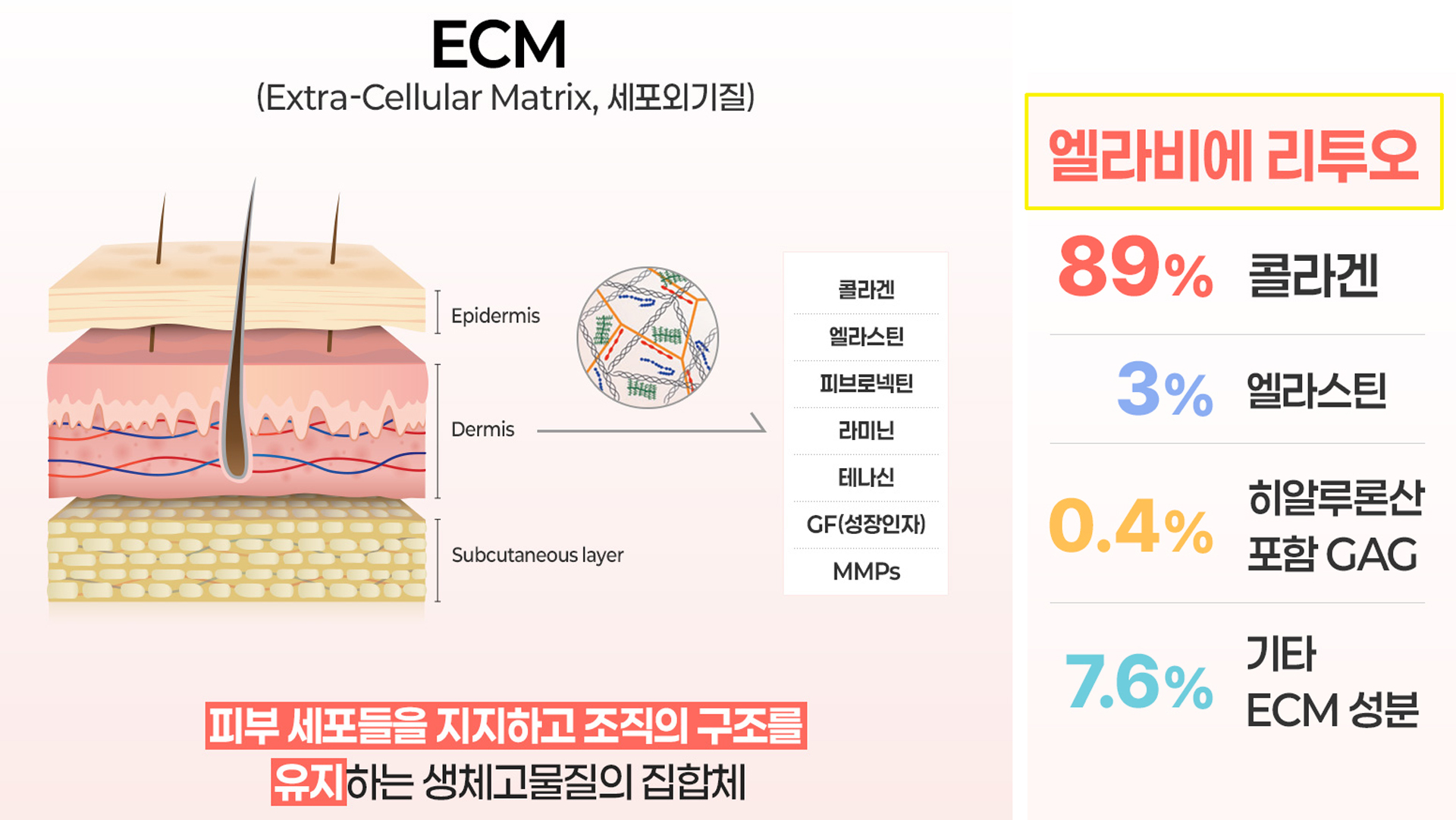 ECM은 콜라겐·엘라스틴·라미닌·피브로넥틴 같은 단백질과 히알루론산 등의 다당류로 이루어져 있습니다.